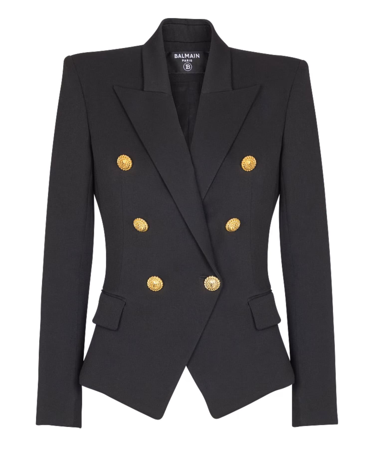 Tailored to perfection, Balmain’s signature fitted jacket is a must-have. The sharply defined shoulders and cinched waist create a beautiful, sculpted silhouette, while six gold-tone embossed buttons add the house’s iconic detailing. Finished with peak lapels and flap pockets, this jacket instantly pulls any look together. Pair it with the Logo T-shirt for that effortless Parisian edge.