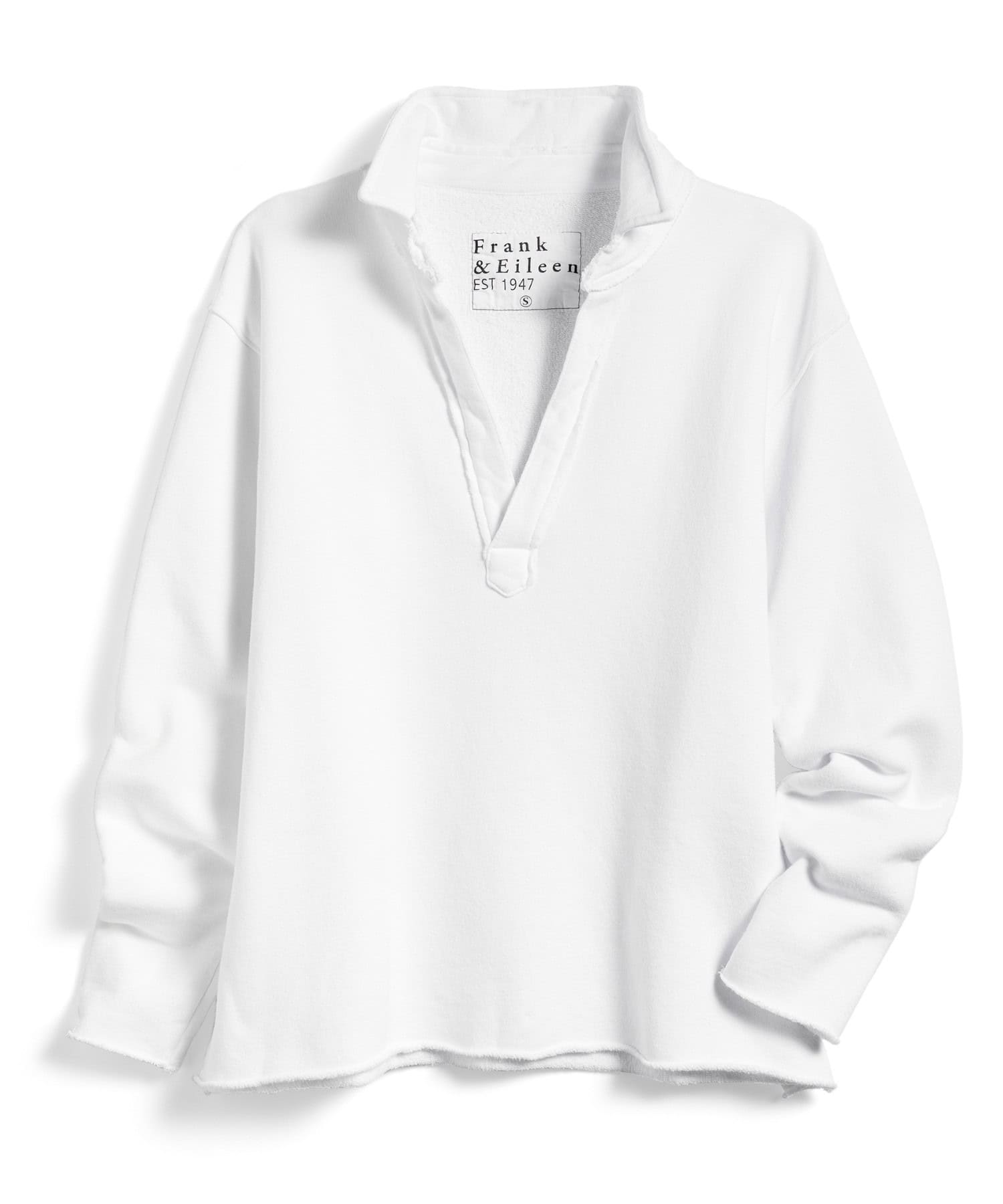 The Patrick Popover by Frank & Eileen in white fleece is the kind of top you’ll reach for on repeat. With a sporty v-neckline, subtle drop sleeves, and a raw-cut hem that gives the illusion of a cropped fit—without actually losing any length—it’s the perfect mix of relaxed and refined. Whether you’re heading out for a morning stroll or meeting friends for brunch, pair it with the Pearl Short for an easy, elevated set.
